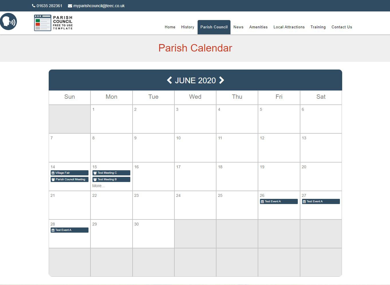 The latest version of the template now supports a Calendar Widget. This widget can be used on a page and brings into an online calendar all meetings and events that are created using the template functions.